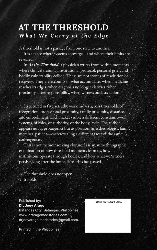 At the Threshold examines moments when professional expertise, personal grief, and institutional constraints converge at the edge of what medicine can manage. Dr. Jose Apollo J. Arago documents encounters with serious illness and mortality from multiple positions—as anesthesiologist, brother, son, and administrator—tracing how proximity to death shapes clinical judgment, professional identity, and the body that carries both.